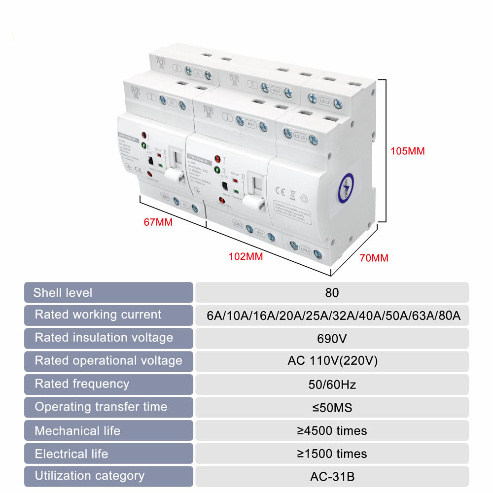 ATS 80A PC AC Changeover Switch DIN Rail Dual Power Photovoltaic